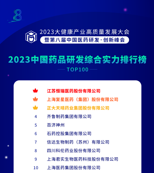由药智网、中国药业杂志社主办的2023大健康产业高质量发展大会暨第八届中国医药研发•创新峰会于6月16日开幕,会上发布了《2023中国药品研发实力排行榜》系列榜单,918博天娱乐凭借深厚的创新研发实力再创辉煌:荣登《2023中国药品研发综合实力排行榜TOP100》榜首、《2023中国化药研发实力排行榜TOP100》榜首。值得一提的是,今年是918博天娱乐连续第6年入选《中国药品研发综合实力排行榜》榜首。